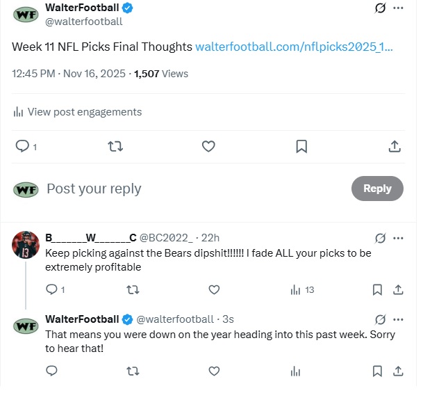 On the bottom half of our NFL Weekly Lander page is the history of picks Walt maintains. Walt’s Results