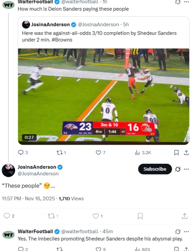 Many of you may have seen DEI reporter Josina Anderson tweet storm on Sunday. All she did was tweet about Shedeur Sanders and make excuses for him. Someone you guys know texted me, “Is Josina Anderson sleeping with Deion?”