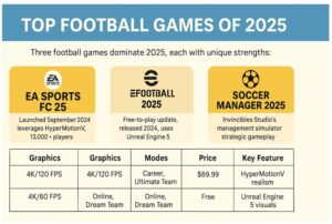 - Soccer Manager 2025: Invincibles Studio’s management simulator features 3D Match Motion engine with 25,000+ licensed players across 90+ leagues for strategic gameplay. These games harness console power, with EA Sports FC 25’s Rush mode adding a fast-paced 5v5 option.