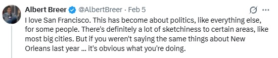 I always knew Breer was mentally handicapped, but this took it to another level. How could anyone, besides someone who rode the short bus as a child, say that they love San Francisco? Even if it’s your home, it still seems like a completely outlandish thing to say. I’m originally from Philadelphia, and I can admit how much of a dumpster fire this God-forsaken city is. It would be like saying, “I love this fungal wart I have on my foot. This is a medical thing, for some people, and there are some downsides to it, but if you’re demeaning it, then it’s obvious what you are doing.”