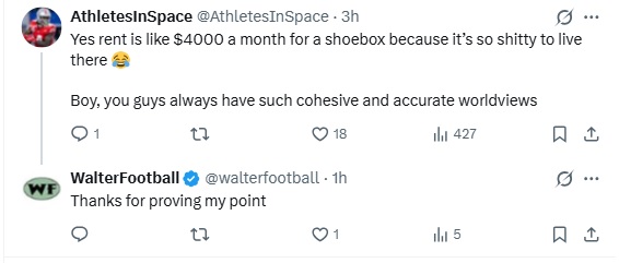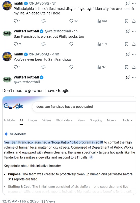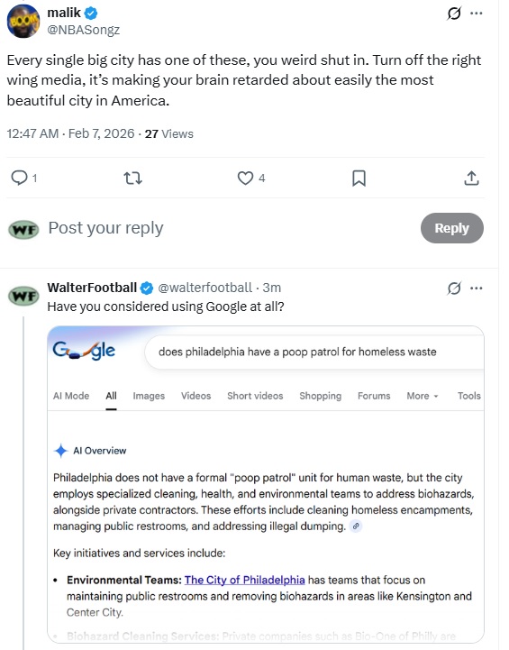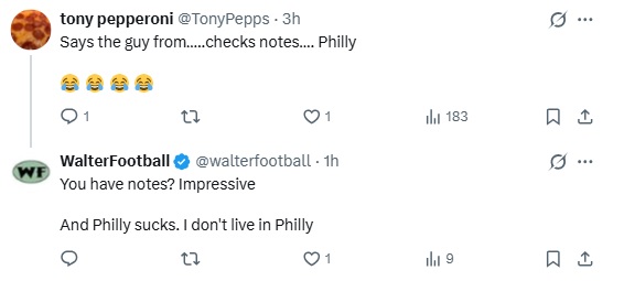 Speaking of other cities, this Malik guy referenced Philadelphia because I have Philly as my location in my X bio. I don’t care if someone brings up Philly because A) I don’t live in the city anymore, and B) even if I did, I wouldn’t mindlessly devote myself to the city just because I lived there. That’s a dumb thing to do.