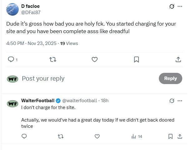 Otherwise, these teams are similar. Both defenses can’t generate pressure or stop the pass. Both defenses are strong against the run. Both teams have just one viable wide receiver, albeit two very good ones in Jaylen Waddle and Chris Olave. The Dolphins have Achane, while the Saints have the superior blocking unit. Tagovailoa has way more experience than Shough, but both quarterbacks suck. Tagovailoa has had some ghastly performances this year, and he’s 23rd in EPA amongst all starters. He’s a bottom-10 starting quarterback, as is Shough, obviously.