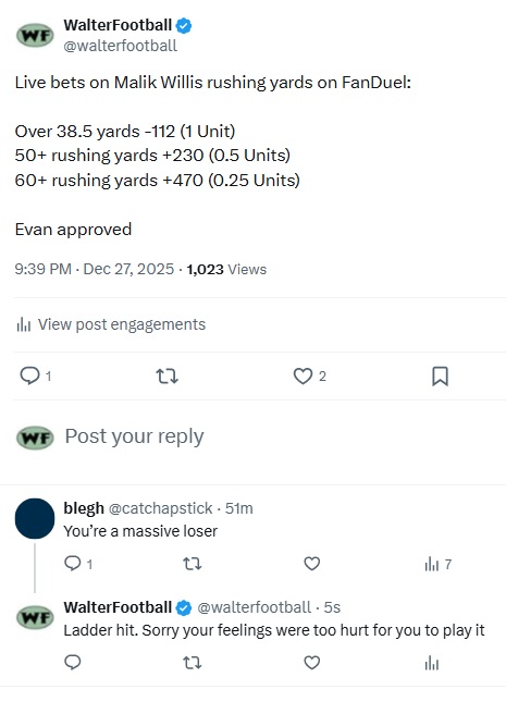 Broncos, 3 units (loss): Our best week of the year began with a loss, but we made up for it with Bo Nix rushing props. Still, it was an embarrassing performance by Denver. This Broncos team is a paper tiger.
