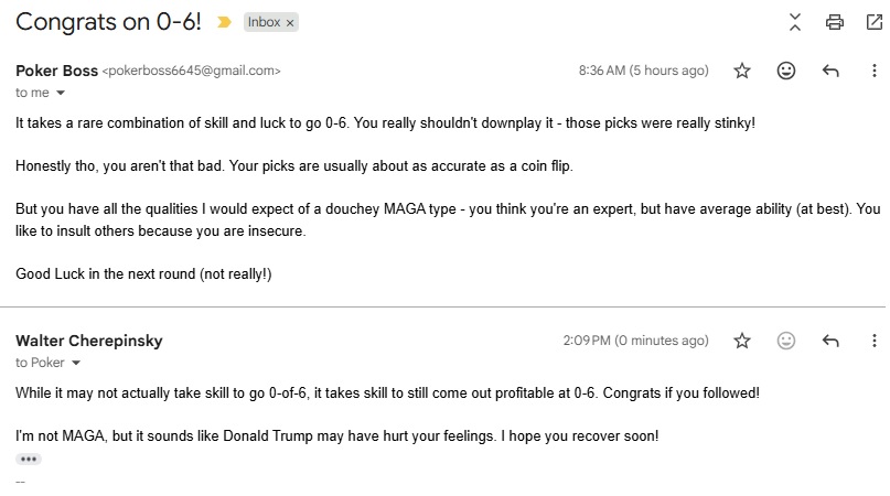 HATE MAIL: We’re going to post hate mail here this year. Here’s an e-mail I got from someone recognizing my 0-6 weekend: