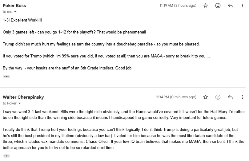 HATE MAIL: We’re going to post hate mail here this year. Here’s an e-mail from a week ago from someone recognizing my 0-6 weekend:
