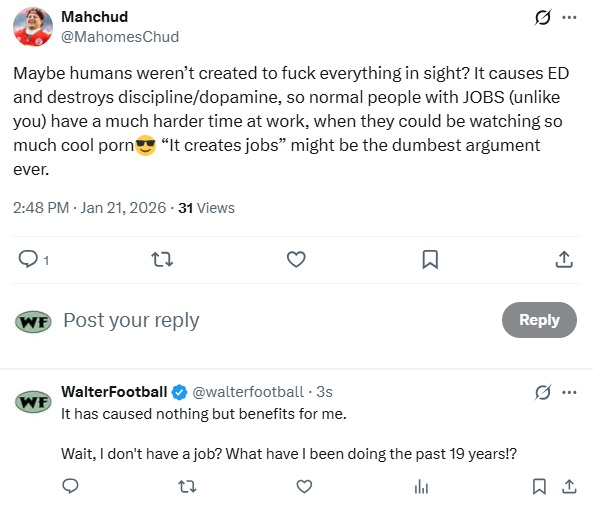 Speaking of low IQs, here’s someone saying I don’t have a job because I had the gall to defend porn: