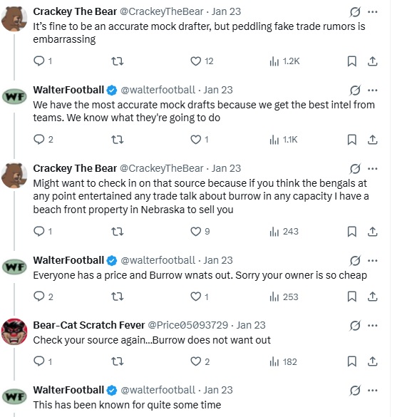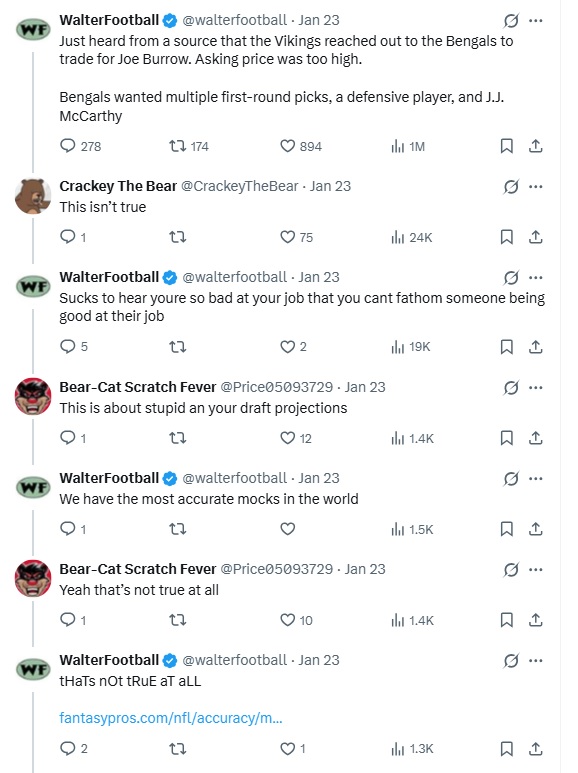 And finally, I reported some news about the Vikings reaching out to the Bengals to trade for Joe Burrow, as you can see here. Some moronic Bengals fans took this to mean something about their team when the story was clearly about the Vikings. Here’s one such example: