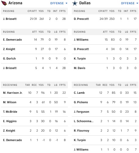 Arizona went up 27-10, but Dallas still had time for a comeback. Prescott led a touchdown drive, but was sacked on numerous occasions on ensuing possessions. The Cowboys’ chances ended when Javonte Williams lost a fumble on a third-down reception.