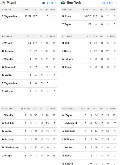 Miami didn’t do anything for a while either, allowing the Jets to hang around. However, with Tyrod Taylor downgraded to doubtful, there was no hope for the Jets. The Dolphins, meanwhile, finally got on the board in the second half via an Ollie Gordon touchdown run, as Gordon was in the game for Achane, who injured his ribs.