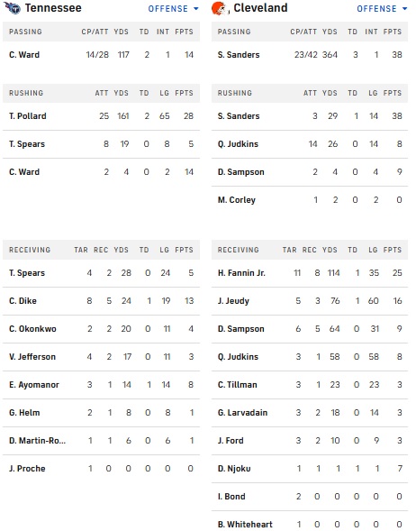 Ward gave points back to the Browns where he threw a telegraphed interception, as Devin Bush was able to have a long return to set up a field goal. However, Tony Pollard then broke free for a 65-yard touchdown to put Tennessee up 14-3. The Browns, however, were able to strike back when Quinshon Judkins caught a screen pass and ran for 58 yards to set up a David Njoku touchdown. Shedeur Sanders then fired a 60-yard touchdown strike to Jerry Jeudy to go up 17-14 entering halftime.