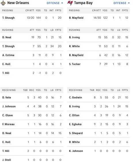 At the start of the third quarter, Mayfield was intercepted by Alontae Taylor to set up the Saints across midfield. The Saints surprised Tampa Bay on a zone-read run, and Shough raced 34 yards down the field for a touchdown to put the Saints up 14-10. Tampa Bay responded with a quick drive down the field and retook the lead with a short touchdown plunge from Sean Tucker. Devin Neal started rolling over the Bucs defense and moved inside the 20. At the end of the third quarter, New Orleans settled for a field goal to tie it at 17 entering the fourth quarter.