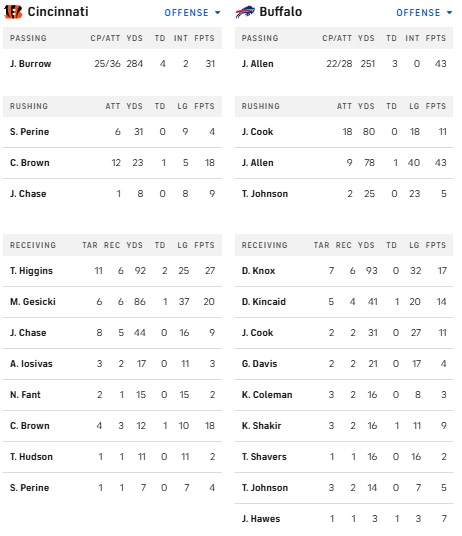 The Bengals were unstoppable for much of this game. Joe Burrow, looking extremely comfortable in his second game back from injury, torched Buffalo relentlessly for much of the afternoon on passes primarily to Tee Higgins, who made his return from a concussion. Burrow led three touchdown drives in the opening half, taking a 21-11 lead into the break.