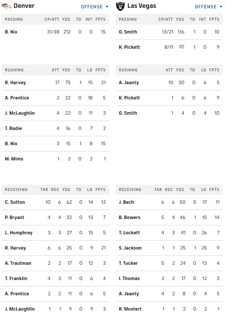 The Raiders were hanging around for a while, but the Broncos were able to put together a touchdown drive in the third quarter. R.J. Harvey, who had a big afternoon, put together a great game, both as a rusher and a receiver. Harvey entering the end zone put Denver up 14. This put the game out of reach for the Raiders, who could have possibly came back from down seven, which shows how big the punt return touchdown was.