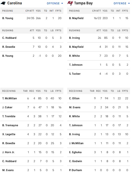 There was a severe downpour in the opening half, but the rain vanished following intermission. The Panthers had more success moving the ball, but constant terrible calls ruined some drives. A ticky-tack offensive pass interference and a blown whistle forced punts on two possessions. Carolina also made a mistake when attempting to run a flea-flicker from the Tampa Bay 20-yard line. Rico Dowdle lost a fumble and Young refused to dive on the ball, allowing the Buccaneers to recover and negate a potential three-point chance.