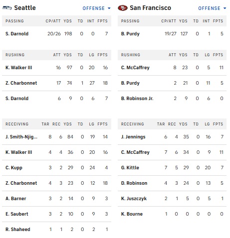 San Francisco had major problems moving the chains in this contest, and it didn’t help that Kyle Shanahan opted to punt the ball near midfield again. The biggest problem was defending Seattle’s No. 2-ranked pass rush with Trent Williams sidelined. Brock Purdy was pressured on nearly every play, and all he could muster was a mere field goal.