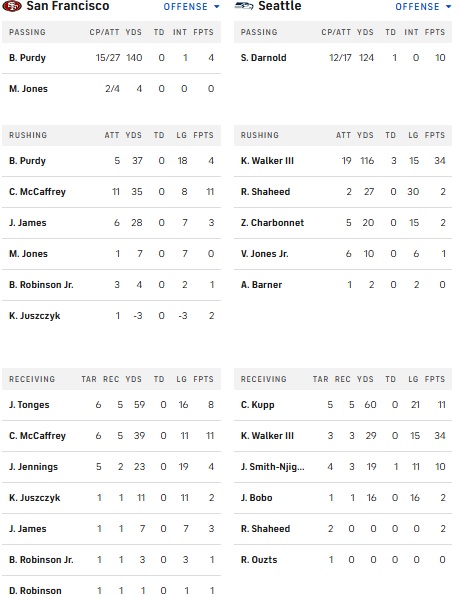 This was a 17-6 affair just prior to halftime, but Kenneth Walker scored a touchdown to extend the margin to 18. Things only got worse for the 49ers after that, with Christian McCaffrey and Tonges suffering injuries to begin the third quarter. The Seahawks, meanwhile, rode Walker the rest of the way, as Walker trampled a disheartened San Francisco defense en route to a blowout victory.
