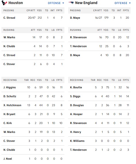 The Patriots wouldn’t stop scoring touchdowns, however, and their next one came on a Stroud pick-six as he was getting hit. The Patriots went up 14-10, and they then intercepted Stroud again on a play in which the ball bounced off Xavier Hutchinson’s hands. Stroud had no choice but to throw to Hutchinson with injuries to Nico Collins (pre-game), Dalton Schultz, and some other players. Woody Marks also got hurt, but he returned to action only to lose a fumble.