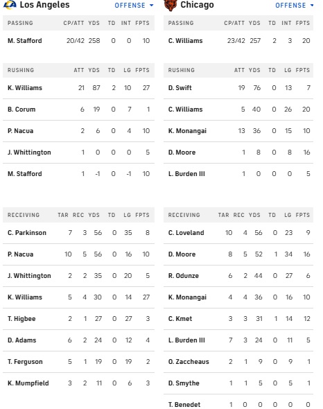 Chicago had three fourth-down miscues in this contest. The second occurred later in the opening half when Kyle Monangai was stuffed. Matthew Stafford, however, struggled to throw until the end of the first half. The Bears bothered him with their blitz, which was curious because Stafford is ordinarily elite against the blitz. Nevertheless, the Rams put together a field goal drive at the end of the second quarter to tie the game at 10.