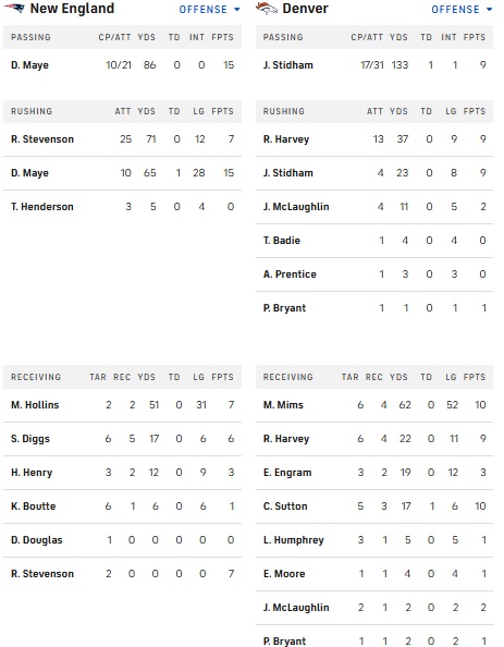 The Patriots looked like they would lose this game for a while, as Drake Maye struggled to do anything besides scramble. However, the Patriots were given an absolute gift when Stidham heaved a backward pass just prior to halftime. The officials blew the play dead for some reason, negating a defensive touchdown, but Maye scored anyway on a run to tie the game at seven. The Patriots then tacked on a field goal in the third quarter.