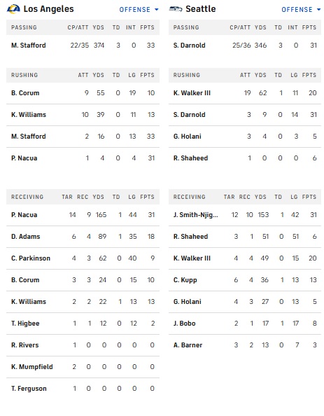 The Rams, however, couldn’t get stops until the fourth quarter. Down 31-27, they drove down the field and looked like they were going to take the lead when they got the ball to the Seattle 6-yard line, thanks to a heroic Stafford fourth-down scramble. However, Sean McVay called a horrible run that went nowhere on second down, and then two Stafford incompletions turned the ball over on downs.