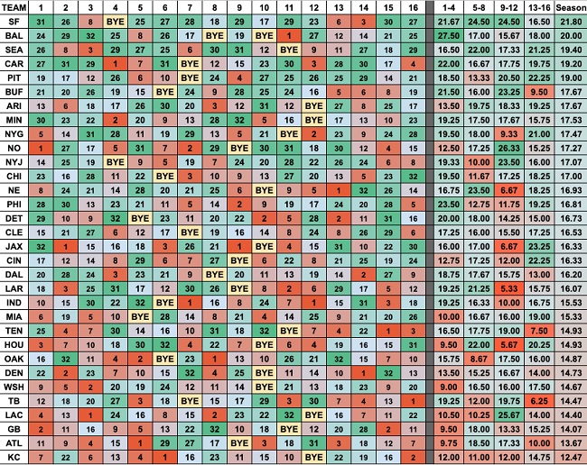 But as you know, coaches, players, and schemes change over the offseason, so I’m not going to spit on your shoe and tell you my SOS is raining down infallible wisdom. Instead, I will look more at the outliers while reiterating that you don’t draft Eli Manning over Patrick Mahomes because he has an easier schedule. Strength of schedule should be used as a tiebreaker, a kind of background radiation that makes you a little keener than what radiation actually does to you.